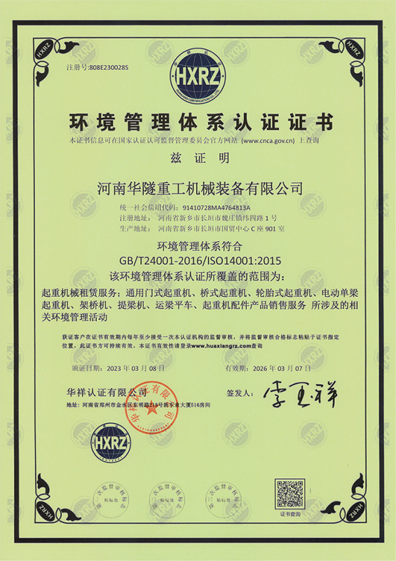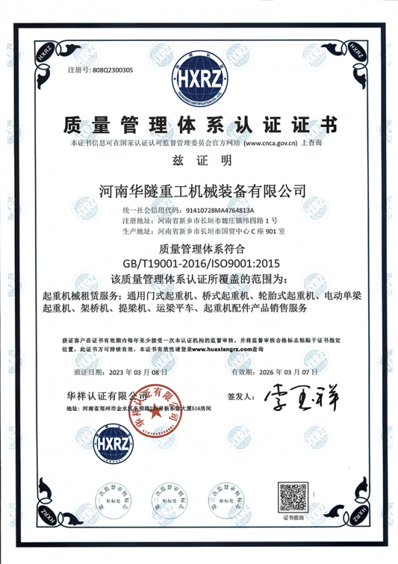 河南華隧重工機械裝備有限公司主要從事通用門式起重機、橋式起重機、電動單梁起重機,輪胎式起重機、架橋機、提梁機、遠梁平車、鋼絲繩電動萌蘆、卷揚機、起重配件制造、銷售:起重機械租賃、安裝和維修,起重設備園收,機械設備維修,鋼結構工程承包,橋梁工程及技術咨淘服務,銷售五金制品、機電設備:建設工程監理,建設工程設計,各類工程建設活動,建筑勞務分包,建筑物折除作業,施工作業,工程管理服務,土石方工程施工,裝如發運。  公司已通過IS0國際質量、環境、健康與安全三合一標準認證,特種設備制造許可證和特種設備安裝改造維修許可證。擁有完熟的質量管理體系。嚴格的管理制度,強大的生產能力和先進的檢測手段,在保證產品質量的同時,也具備了極強的市場競爭力?! 」緢猿挚萍紕撔聻槔砟?,產品質量為核心,注重信譽,建立了減信可靠、快捷、思速。便利周到的售后服務網絡。  我們擁有的技術專家和技術服務隊伍為客戶提供充善的售前技術支持和全天候的售后服務體系,讓您無后顧之憂,享受一站式的超值服務?!  叭A隧重工,伴您成功“是華隧重工永遠的宗指,真被的希望與各界朋友攜手并進。共創輝準!